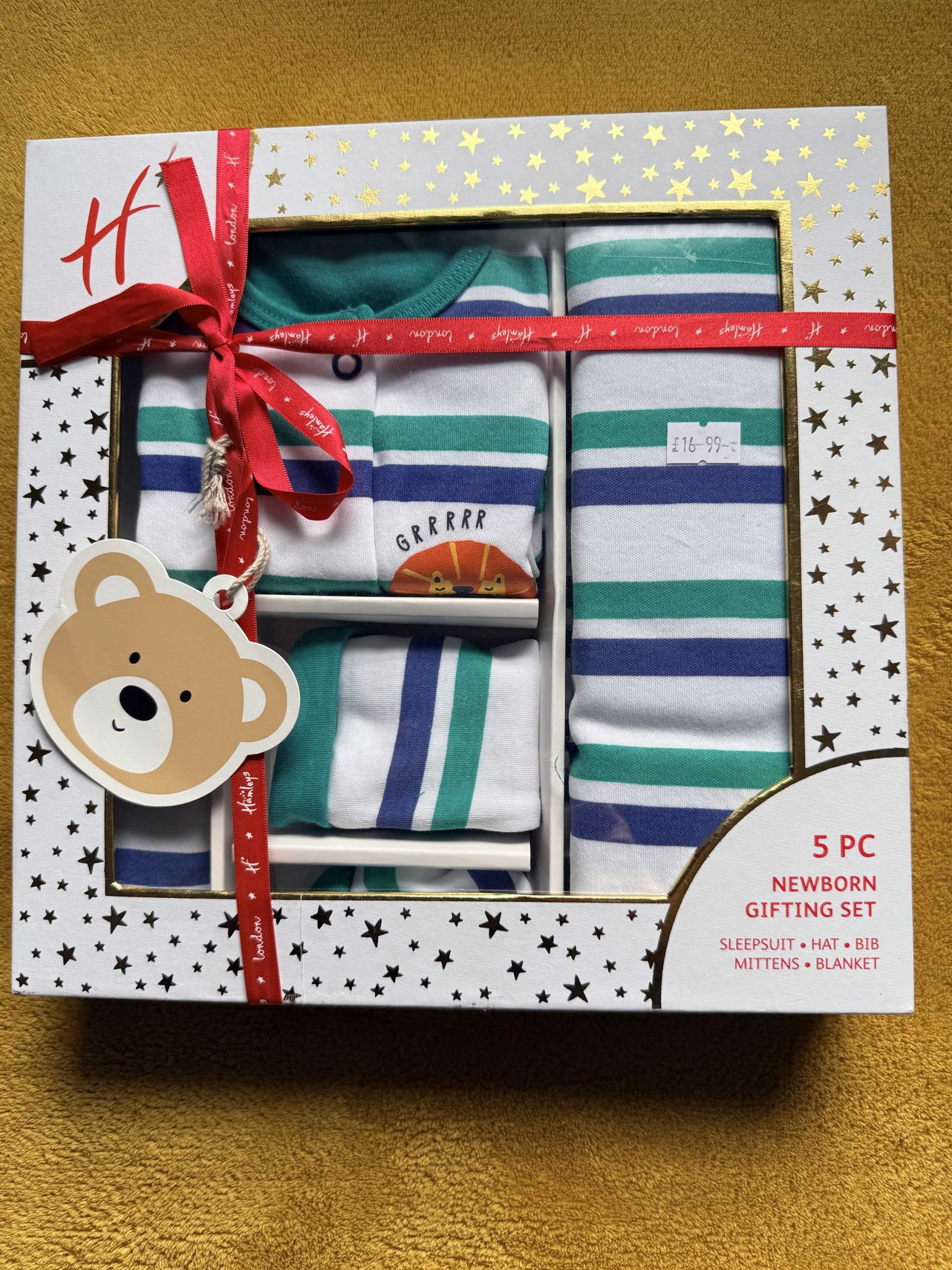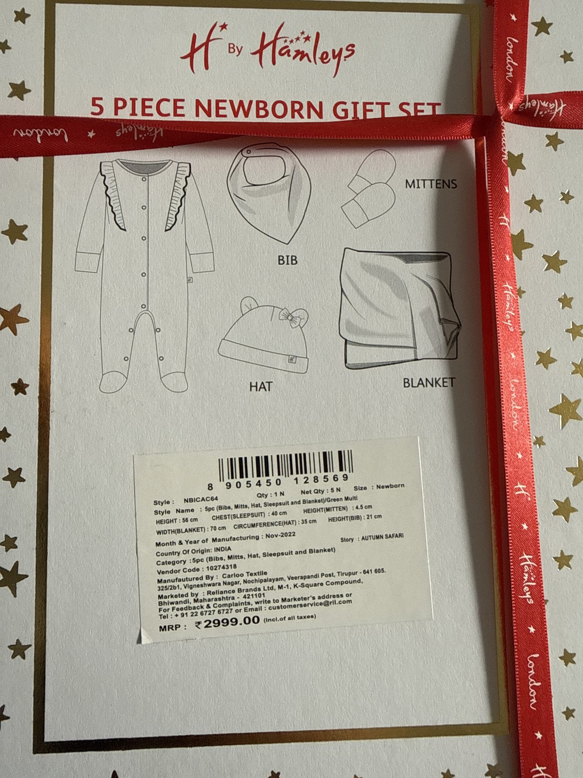 H by HAMLEYS NEWBORN SLEEPSUIT + bib + mittens + hat + blanket set (Green Multi)